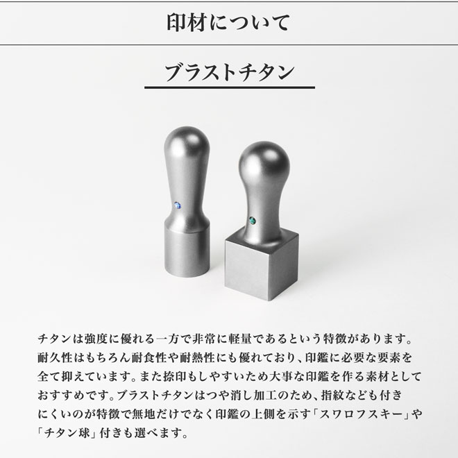 | ブラストチタンはつや消し加工のため、指紋なども付きにくいのが特徴です。 | 印鑑の上側を示すクリスタルのアタリがついています。 |