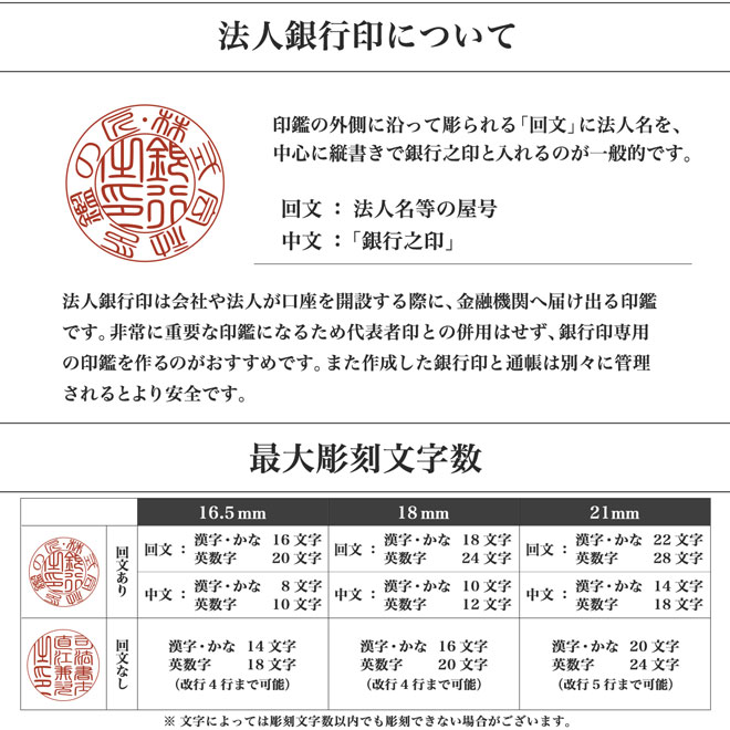 | 印面の外周部分の彫刻内容をさします。 通常は会社名や団体名を入れます。 |