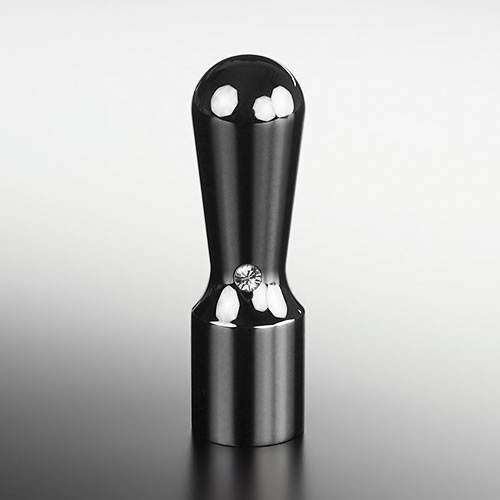 | スタイリッシュな光沢感が特徴的なブラックチタン。 | アタリ付き以外にも印鑑の上側を示すクリスタル付きも選べます。 |
