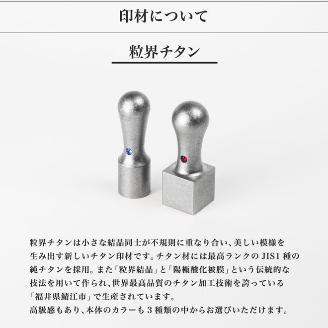 | 商品名称 | 法人印鑑/銀行印/粒界チタン/銀/丸寸胴タイプ/クリスタルアタリ付き/アクアマリン/18.0mm/ケース別売 |