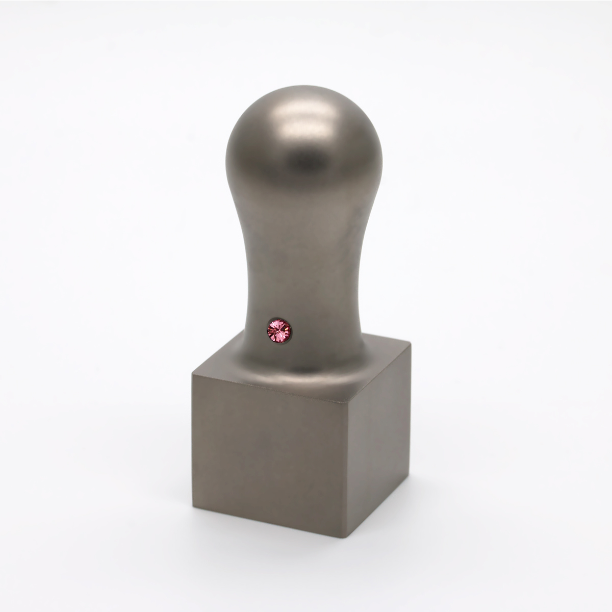 | ブラストチタンはつや消し加工のため、指紋なども付きにくいのが特徴です。 | 印鑑の上側を示すクリスタルのアタリがついています。 |